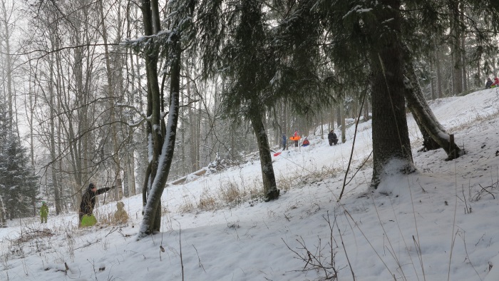 Pulkkamäessä oli viikonloppuna väkeä ja hyvinhän tuo mäki näytti luistavan. Punaisia poskia, innostunutta meininkiä, sitä oli hauska seurata. Itse en mäkeen nyt mennyt, annan kiukuttelevan polveni levätä; se ei oikein tykkää jyrkän ylämäen kiipeämisestä.